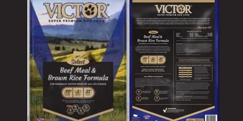 In October, the FDA revealed that Mid America Pet Food initiated a recall on three batches of Victor Super Premium Dog Food Select Beef Meal & Brown Rice Formula dry dog food due to salmonella contamination discovered by independent inspectors .